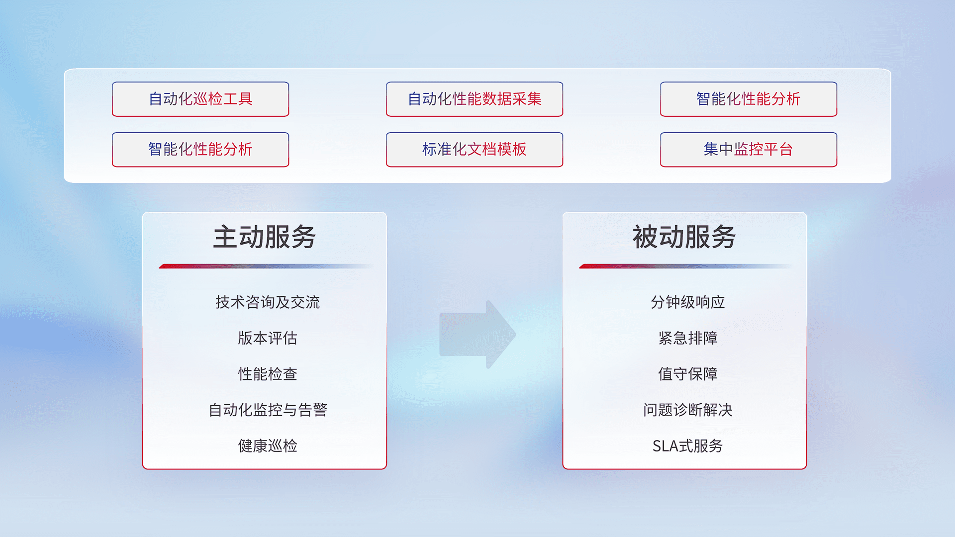 智能化工具和标准化文档,,保障服务质量,,,提供主动服务(包含技术咨询、、版本评估、、、性能检查、、自动化监控与告警、、、健康巡检)和被动服务包含(分钟级响应、、紧急排障、、、、值守保障、、、、问题诊断解决、、、SLA服务)。。
